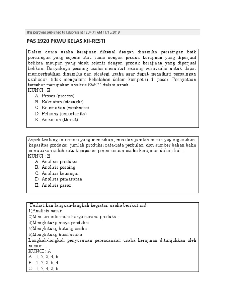 Contoh soal pilihan ganda konsinyasi dan jawabannya tentunya harus dikerjakan ketika uas dan uts. 01 okt 2020 posting komentar. 1 response to soal pilihan ganda dan jawaban pkk 4produk kreatif dan kewirausahaan peluang usaha produk barang jasa unknown 26 february 2020 at 0608 soal dan jawaban nggak ada yang sesuai dengan buku. Soal pts ski kelas 8 semester genap 20i8 20i9 docx matematika kelas 8 matematika kelas 5 matematika kelas 7. Itulah tadi kumpulan soal teks lho pilihan ganda dan jawabannya.